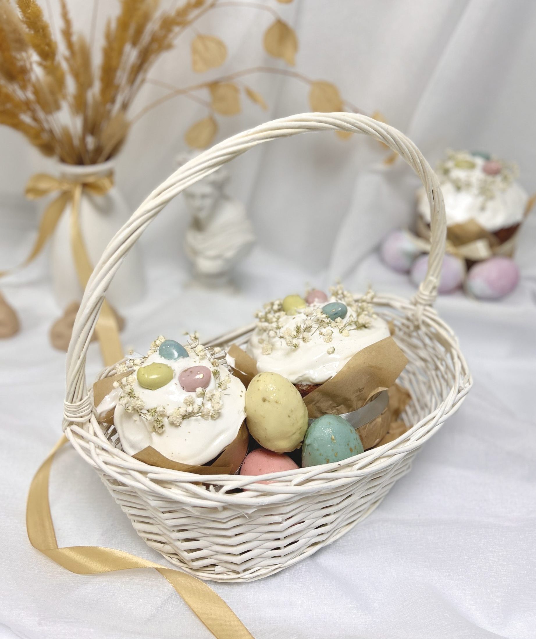 Подарочная корзина с 2-мя ароматными куличами и 3-мя шоколадными яйцами — идеальный подарок для Пасхи!