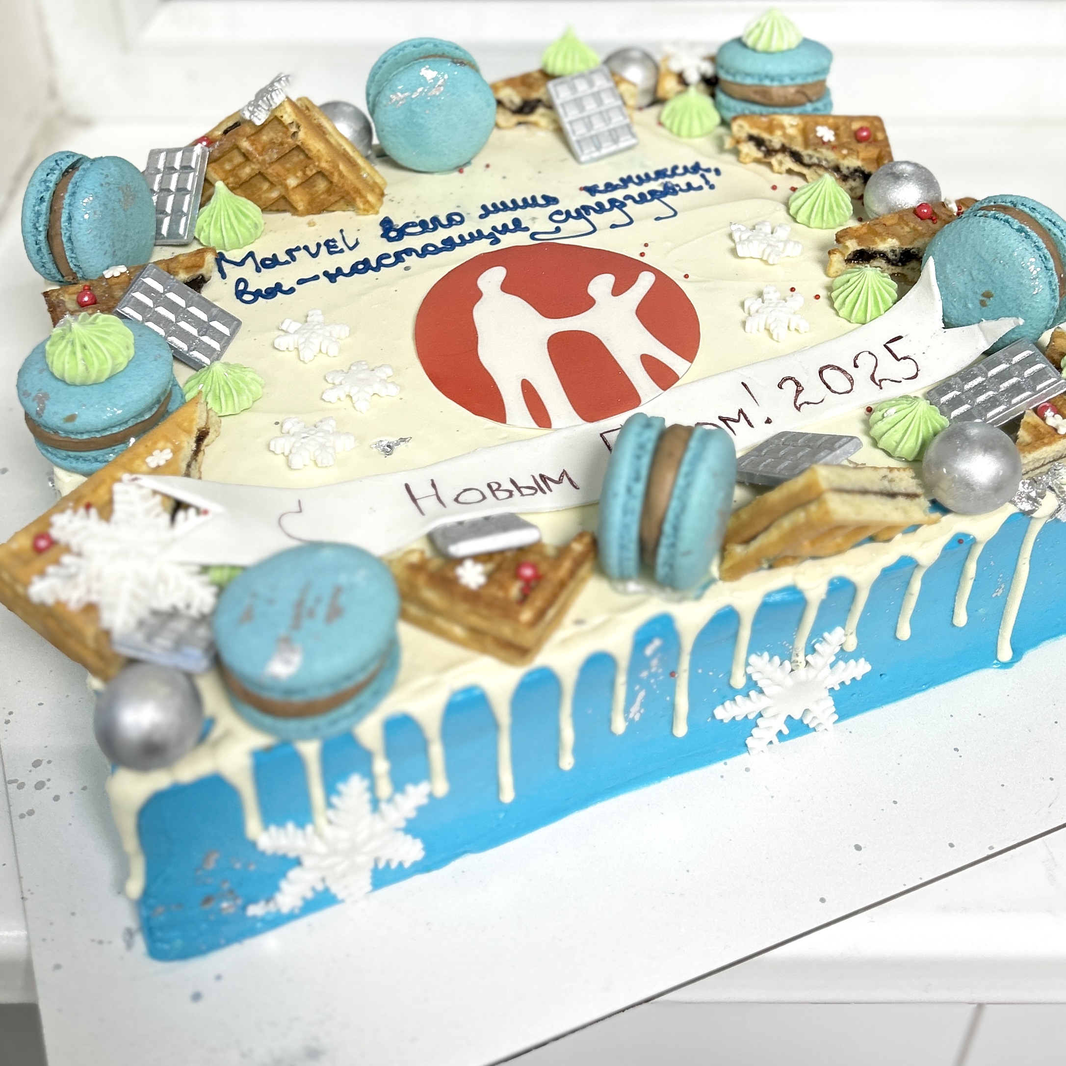 Бисквитный торт с новогодним оформлением и сахарной печатью логотипа. Доступен к заказу от 1,5 кг