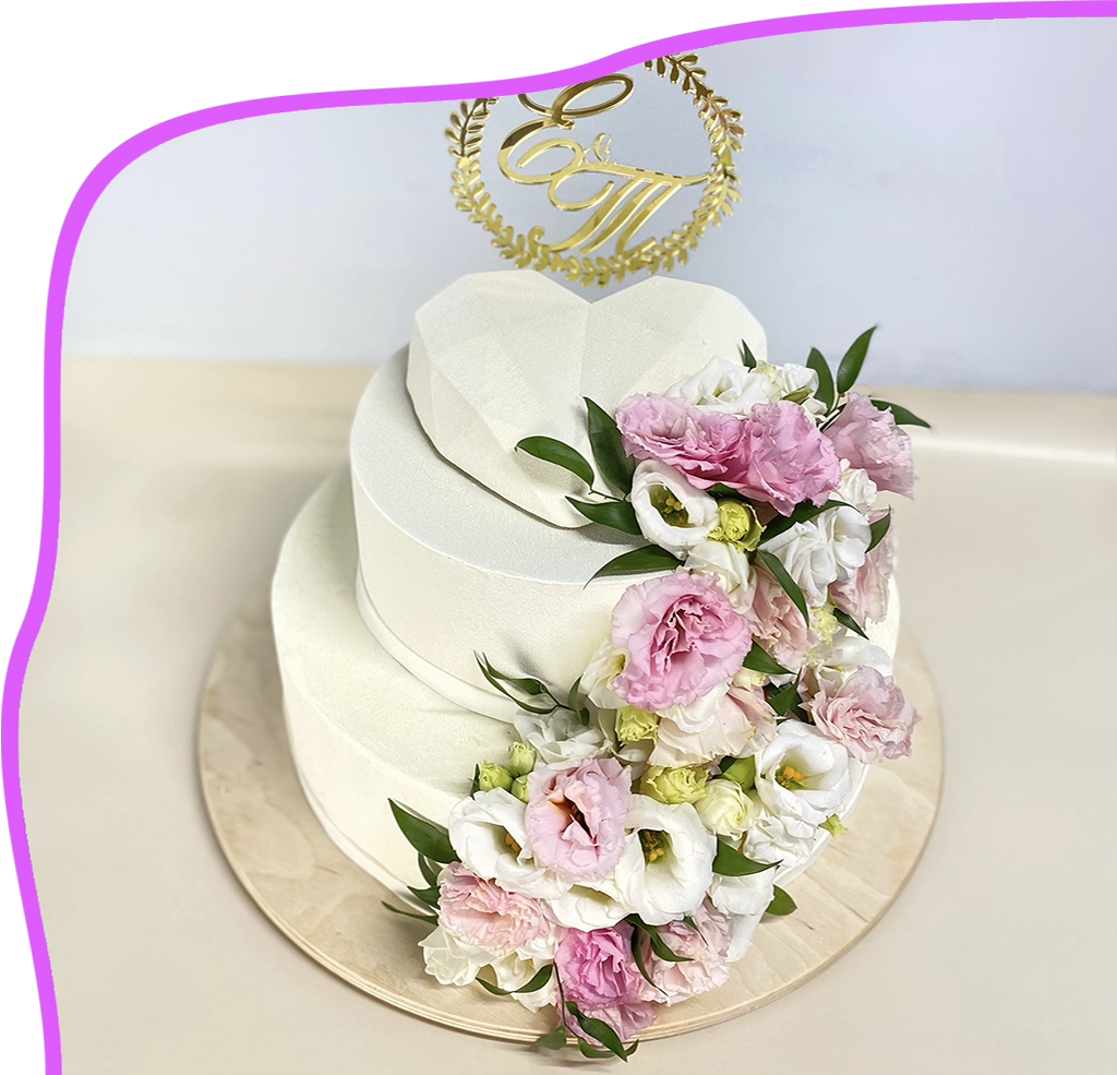- Декор – различные украшения, такие как цветочные боксы, кольца, банты, фигурки или элегантные рисунки из белкового крема или шоколада придут свадебному торту индивидуальность и особый вид. Обсудите с нашим кондитером возможности декорирования и выберите вариант, который подчеркнет стиль вашего праздника.