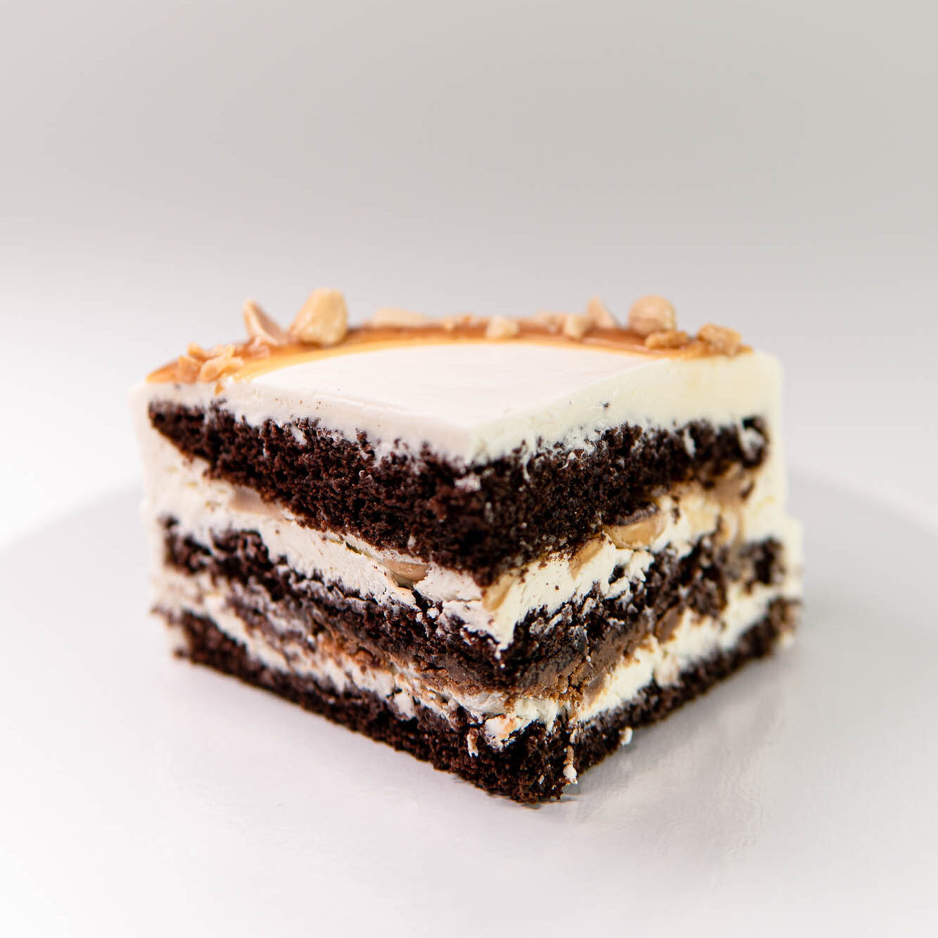 шоколадные бисквиты, пропитанные сливочно-карамельным кремом, соленая карамель с арахисом